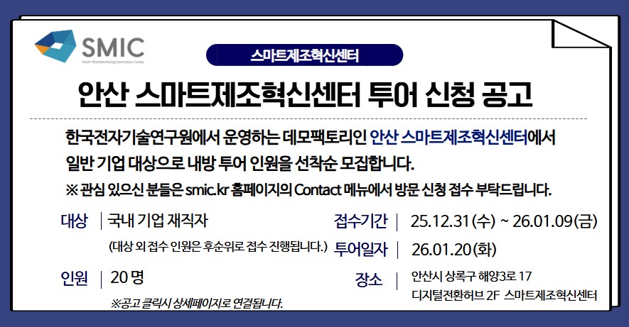 등록일:2023-09-04 제목:안산 스마트제조혁신센터 이전 및 스마트 공장 투어 일시 중단 안내 more