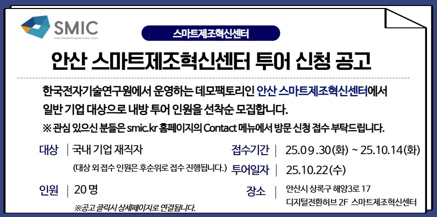 Home Notice 공지사항 공지사항 202520242023 등록일:2024-12-16 제목:[Factory Hack Korea 2025 안내] more 등록일:2024-10-16 제목:제조환경 데이터 분석 툴 배포 분석 교육 지원 more 등록일:2024-05-16 제목:안산 스마트제조혁신센터 10월 기업 투어 안내 more 등록일:2023-10-13 제목:2023 제 1회 디지털트윈 실습 교육 안내 2023 제 1회 디지털트윈 실습 교육 안내 more 등록일:2023-09-04 제목:안산 스마트제조혁신센터 이전 및 스마트 공장 투어 일시 중단 안내 more 등록일:2023-07-31 제목:용인시 스마트공장 개선 고도화 사업 more 등록일:2023-03-24 제목:「사업다각화 지원 플랫폼 사업」 참여기업 모집 공고 more 등록일:2022-05-11 제목:「2022년 사업다각화 지원플랫폼 사업」 희망 기업 모집 공고 more 등록일:2022-01-17 제목:스마트제조혁신센터 환경 리뉴얼 공지 more 등록일:2021-05-13 제목:제2회 제조지능 컨퍼런스 안내(27/28일) more ? ???? ?? 123?? ???? ????? ???? ??