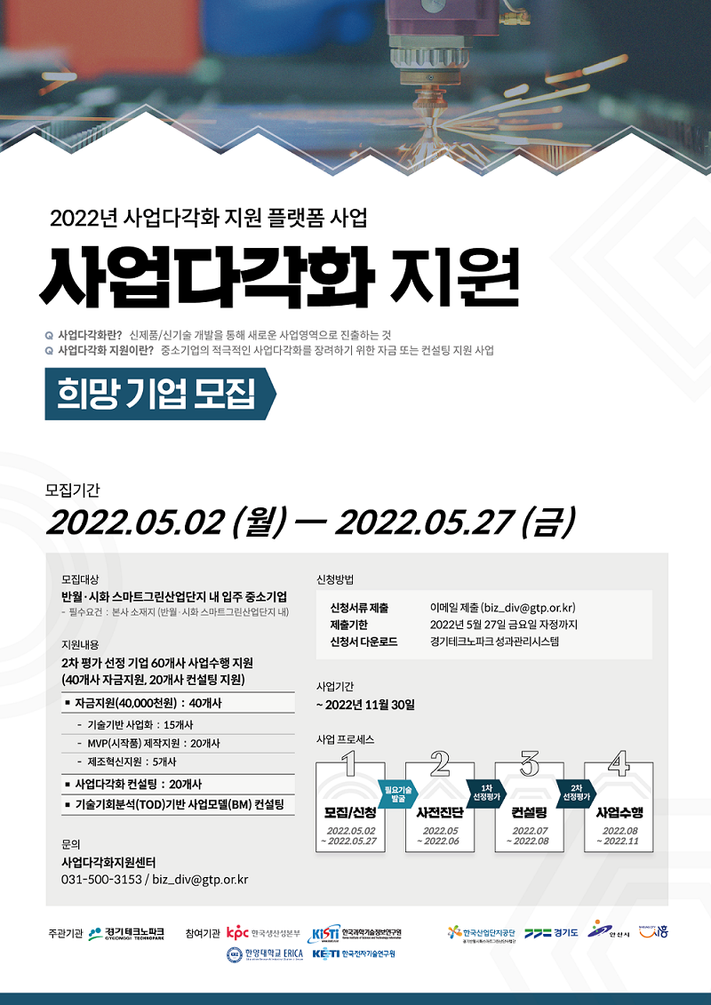 Home Notice 공지사항 공지사항 202520242023 등록일:2022-05-11 제목:「2022년 사업다각화 지원플랫폼 사업」 희망 기업 모집 공고 첨부파일2022년 사업다각화 지원 플랫폼 사업 참여기업 모집 공고.zip 목록 목록