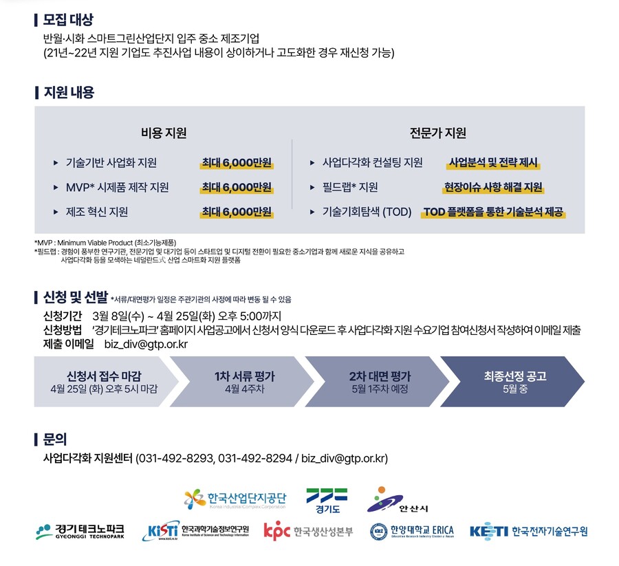 Home Notice 공지사항 공지사항 202520242023 등록일:2023-03-24 제목:「사업다각화 지원 플랫폼 사업」 참여기업 모집 공고 공고문 : http://gofile.me/6SAzk/79SNVGOYt제출서류 양식 : http://gofile.me/6SAzk/S0j6bz4nc 참고 사이트https://pms.gtp.or.kr/web/business/webBusinessView.do?b_idx=161625 목록 목록